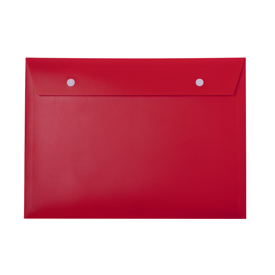 Πρακτική θήκη εγγράφων από ανακυκλωμένο PP, με κύρια θήκη με καπάκι και κλείσιμο με κουμπιά, σε κόκκινο, λευκό, μπλε και μαύρο.