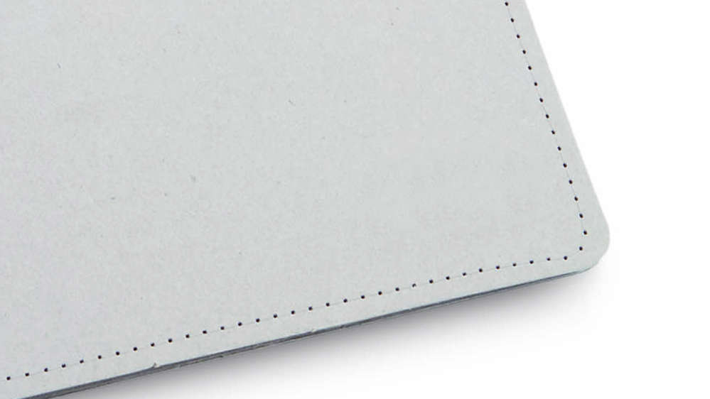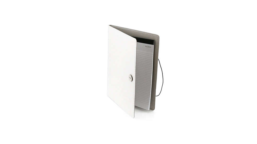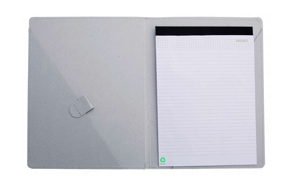 Φάκελος με κλείσιμο με ελαστικό λουράκι, από ανθεκτικό ανακυκλωμένο χαρτόνι με ενισχυμένες ραφές. Εσωτερικά περιλαμβάνει σημειωματάριο 20 φύλλων με ριγέ διάταξη, τριγωνική θήκη και θήκη για στυλό.